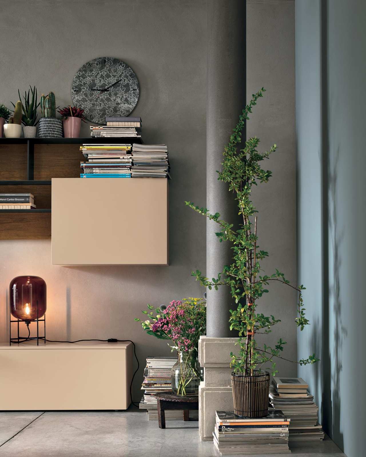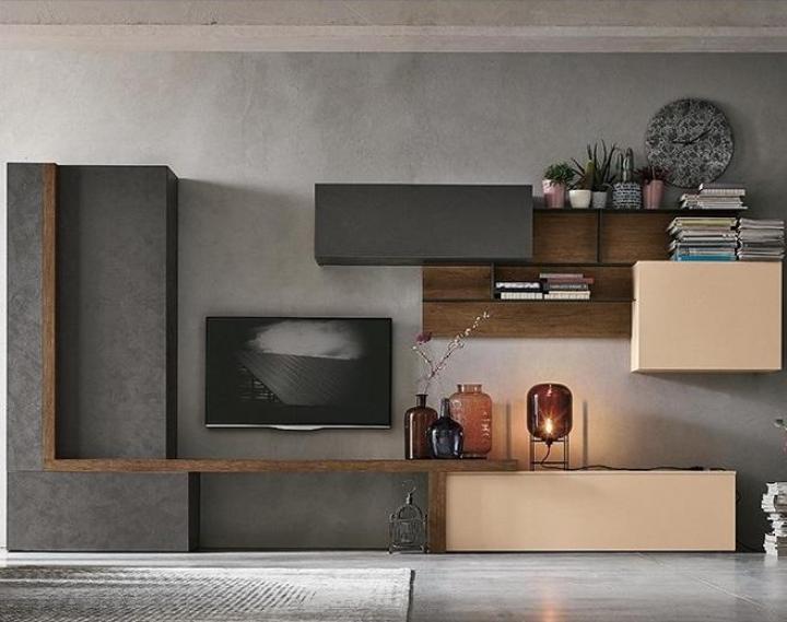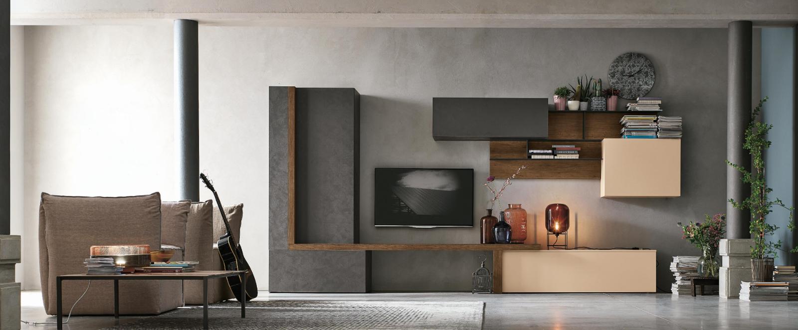 Barevné provedení: zadní panel a detaily v provedení dark knotted finish MT-RNS, skříňky s texturou dark cement MT-CS a v barvě peach 157, kovové prvky v antracitové 160.