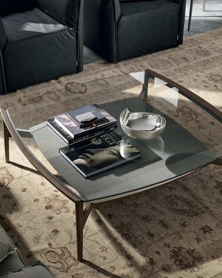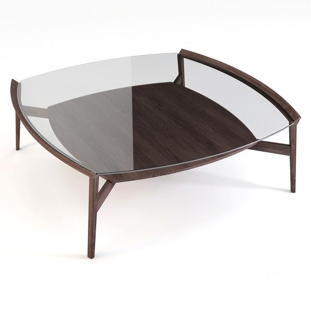 Konferenční stolek Bloom je vyrobený z masivního lakovaného dřeva s deskou z čirého skla o tloušťce 8 mm.