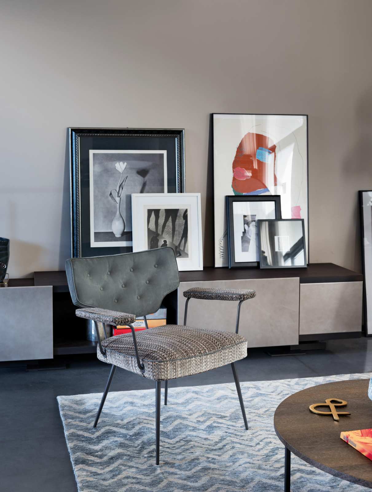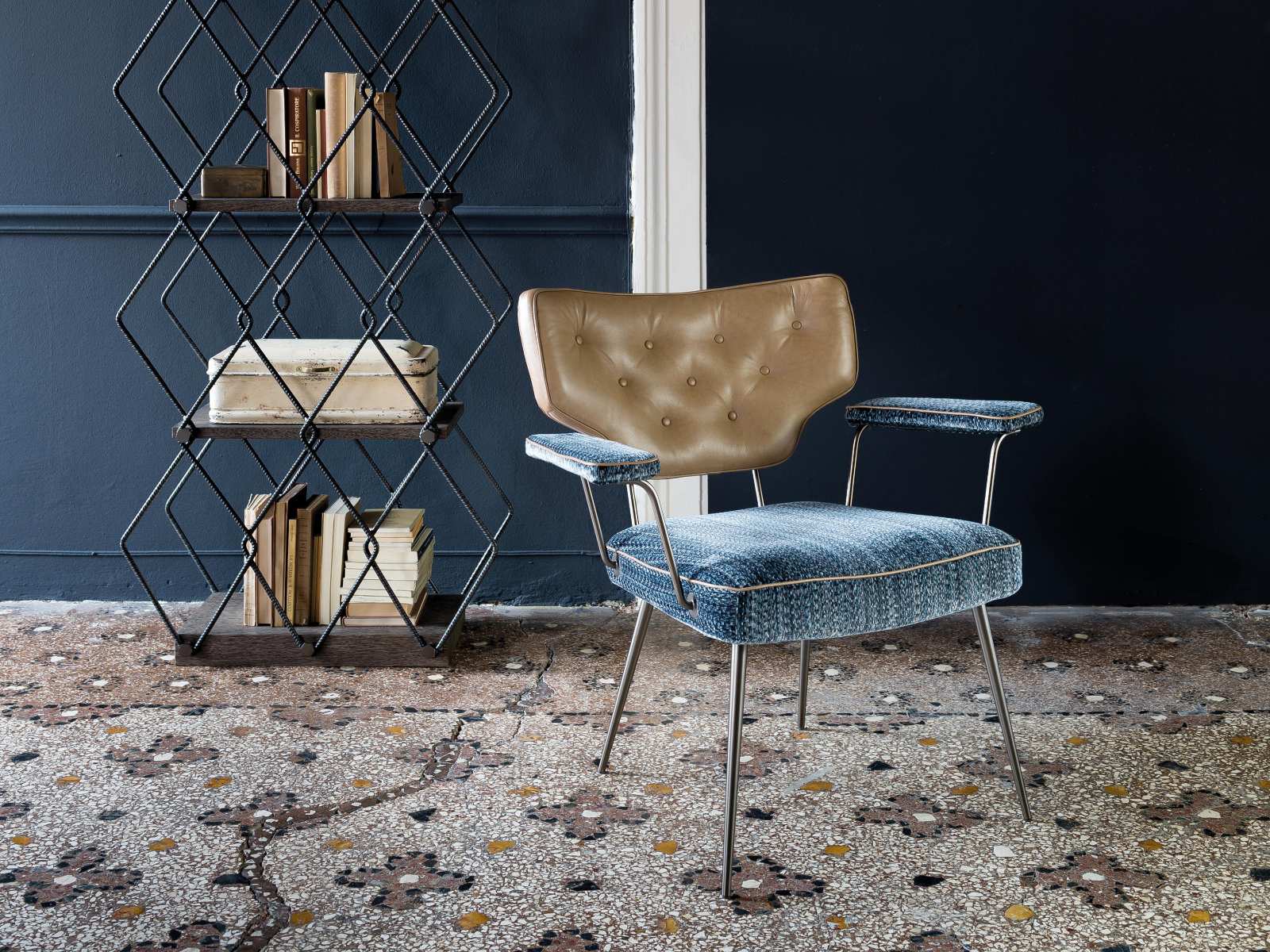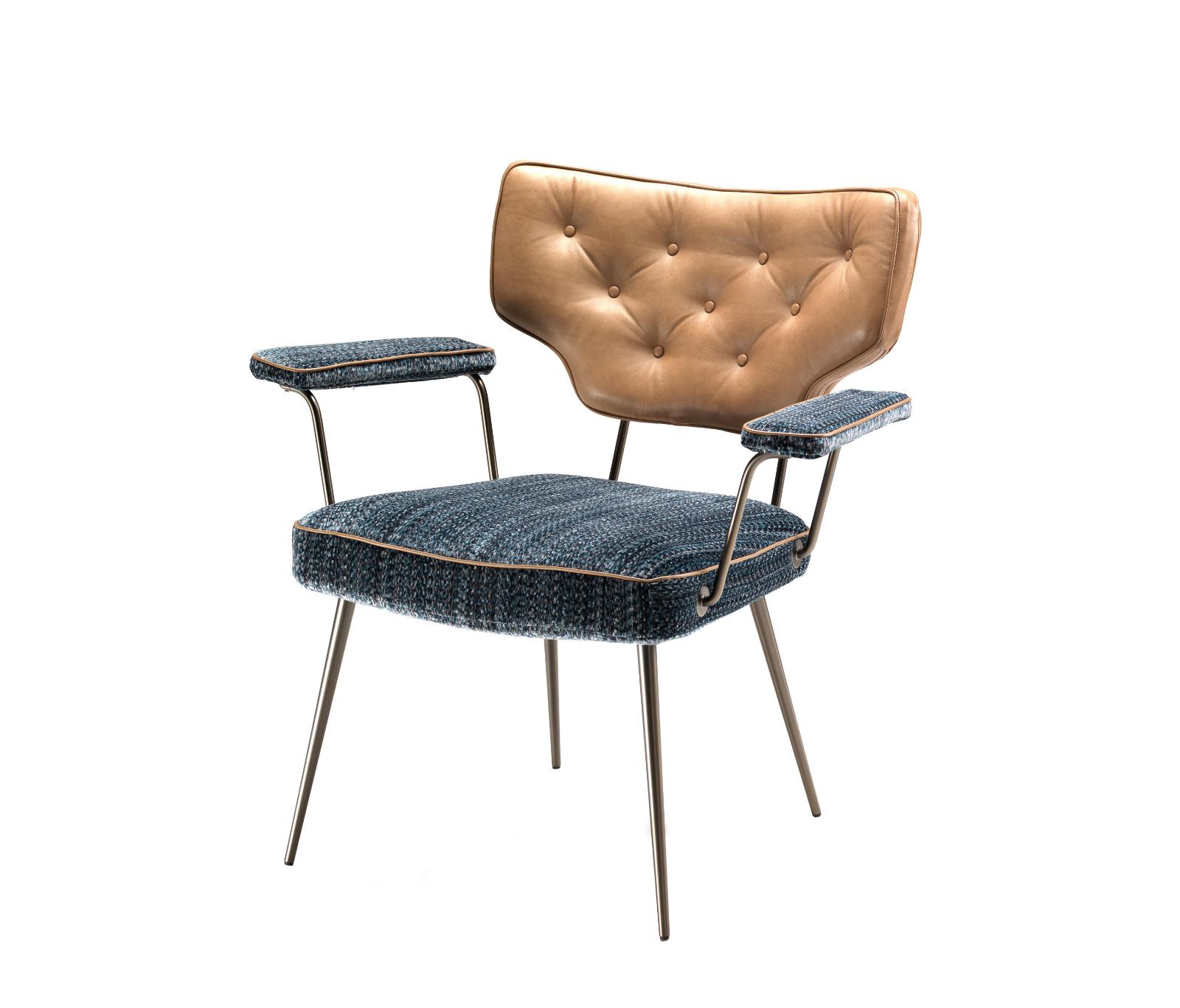 Napůl křeslo a napůl židle, dohromady čistý originál. Křeslo Twiggy má svůj vlastní osobitý retro styl. Kombinace dvou různých potahových materiálů, kůže a látky, ve spojení s odlišnými barvami sedáku a opěrky přidává na výjimečnosti Twiggy.