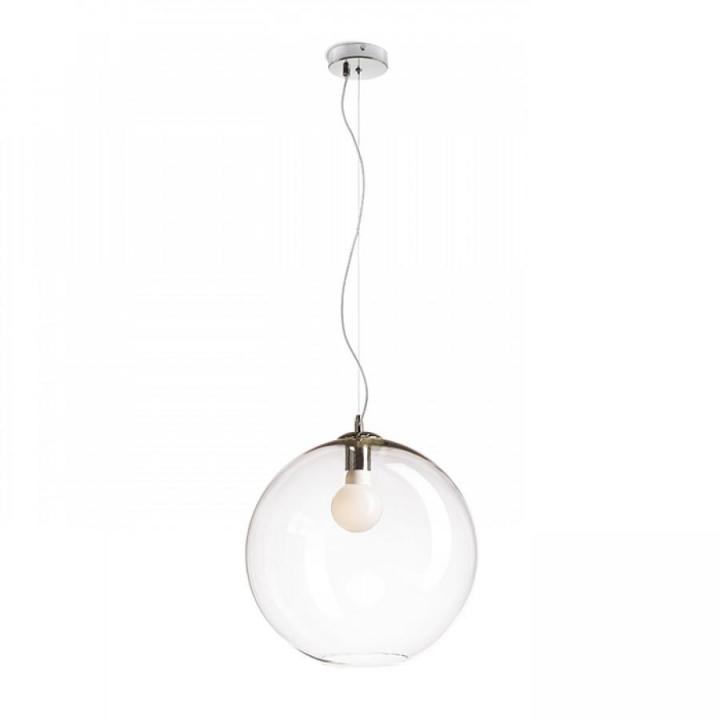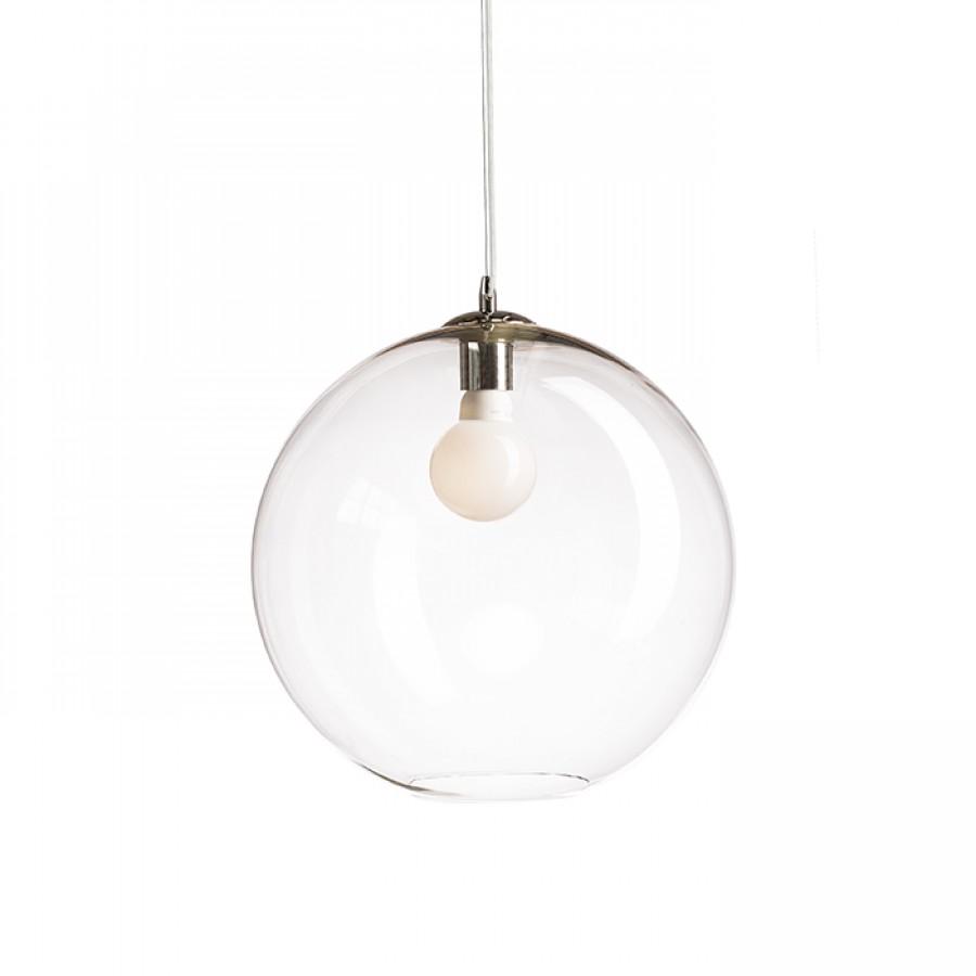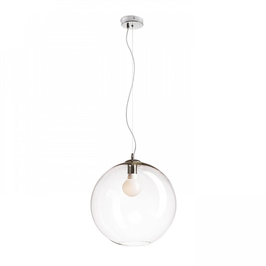 Závěsné svítidlo se stínidlem z ručně foukaného čirého skla a chromovými doplňky. Pro úsporné světelné zdroje s paticí E27. Drobné bublinky ve skle jsou způsobeny výrobním procesem, nejedná se o vadu stínidla.
