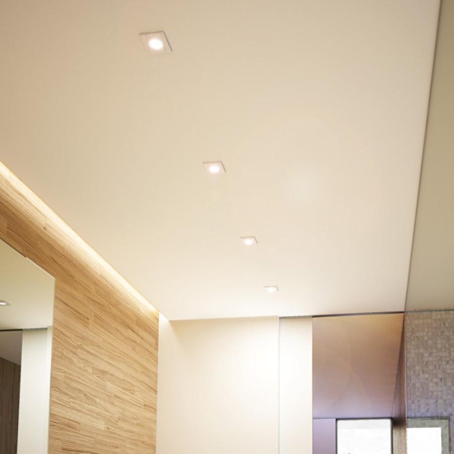 Zápustné svítidlo s rámečkem z česaného hliníku. Průzor svítidla je krytý částečně satinovaným sklem. Vhodné do vlhkého prostředí.
