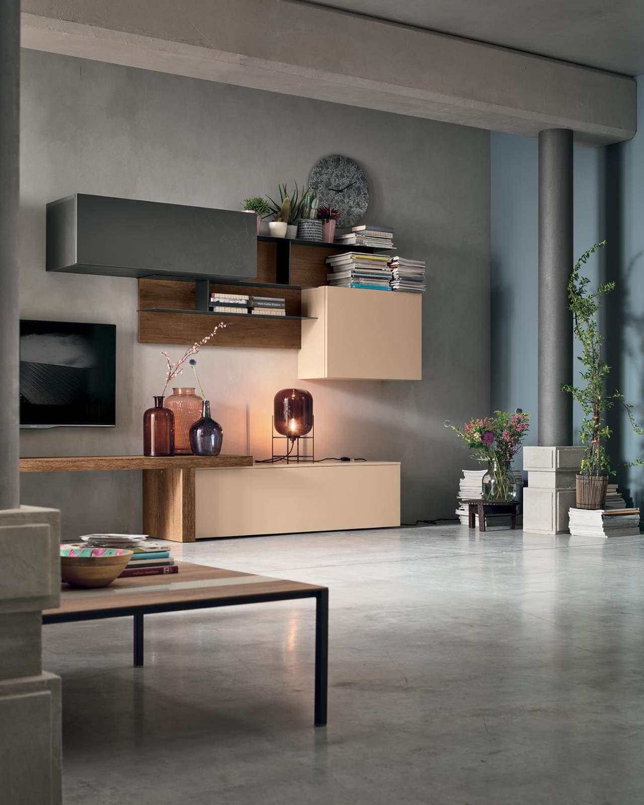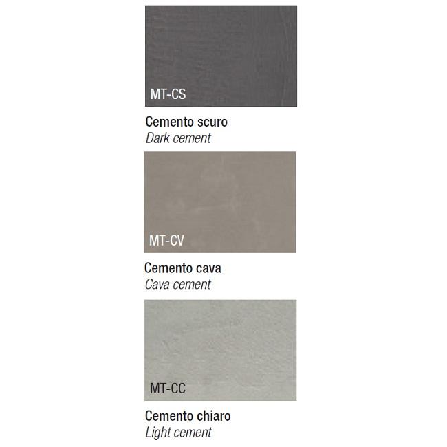 Barevné provedení: zadní panel a detaily v provedení dark knotted finish MT-RNS, skříňky s texturou dark cement MT-CS a v barvě peach 157, kovové prvky v antracitové 160.