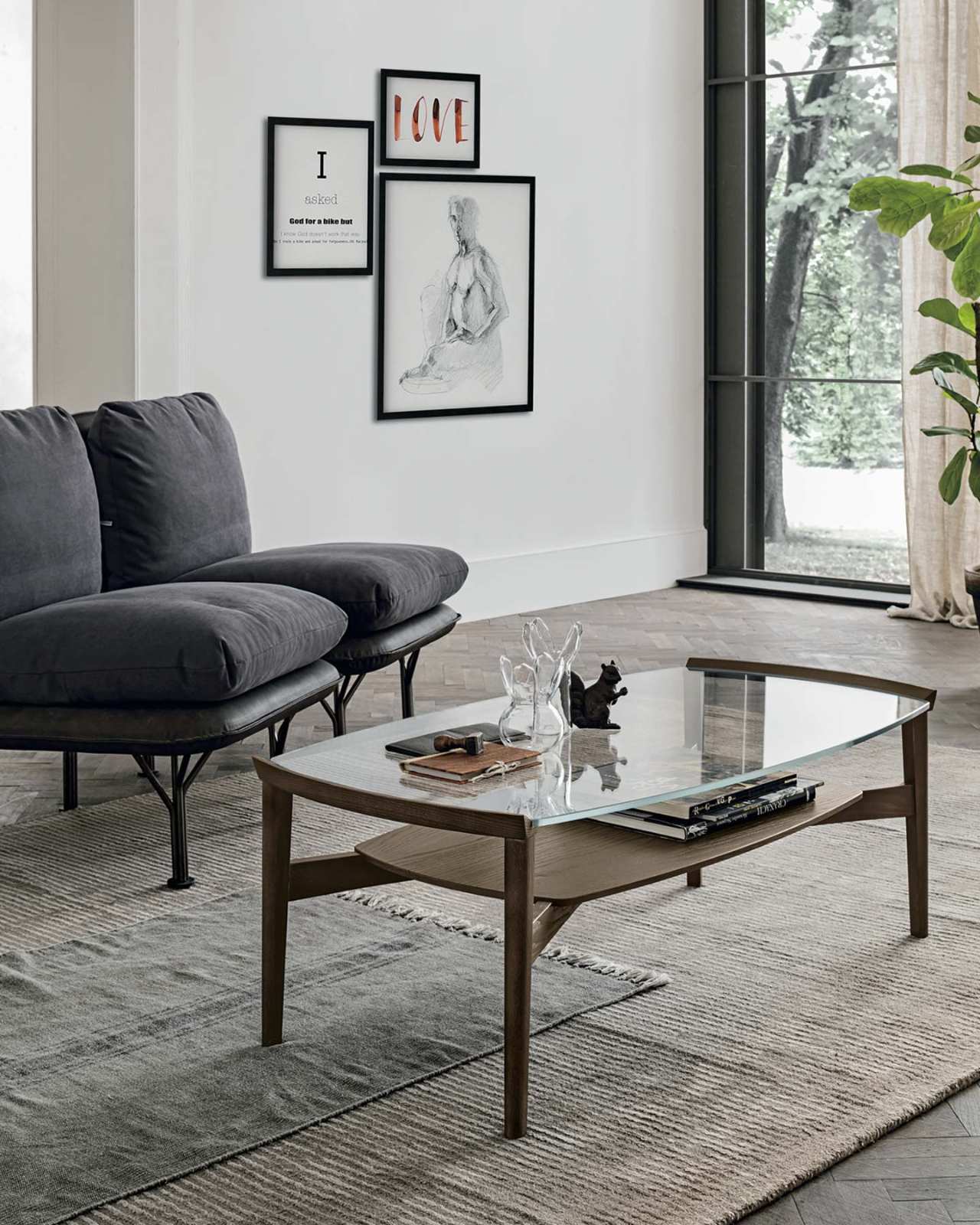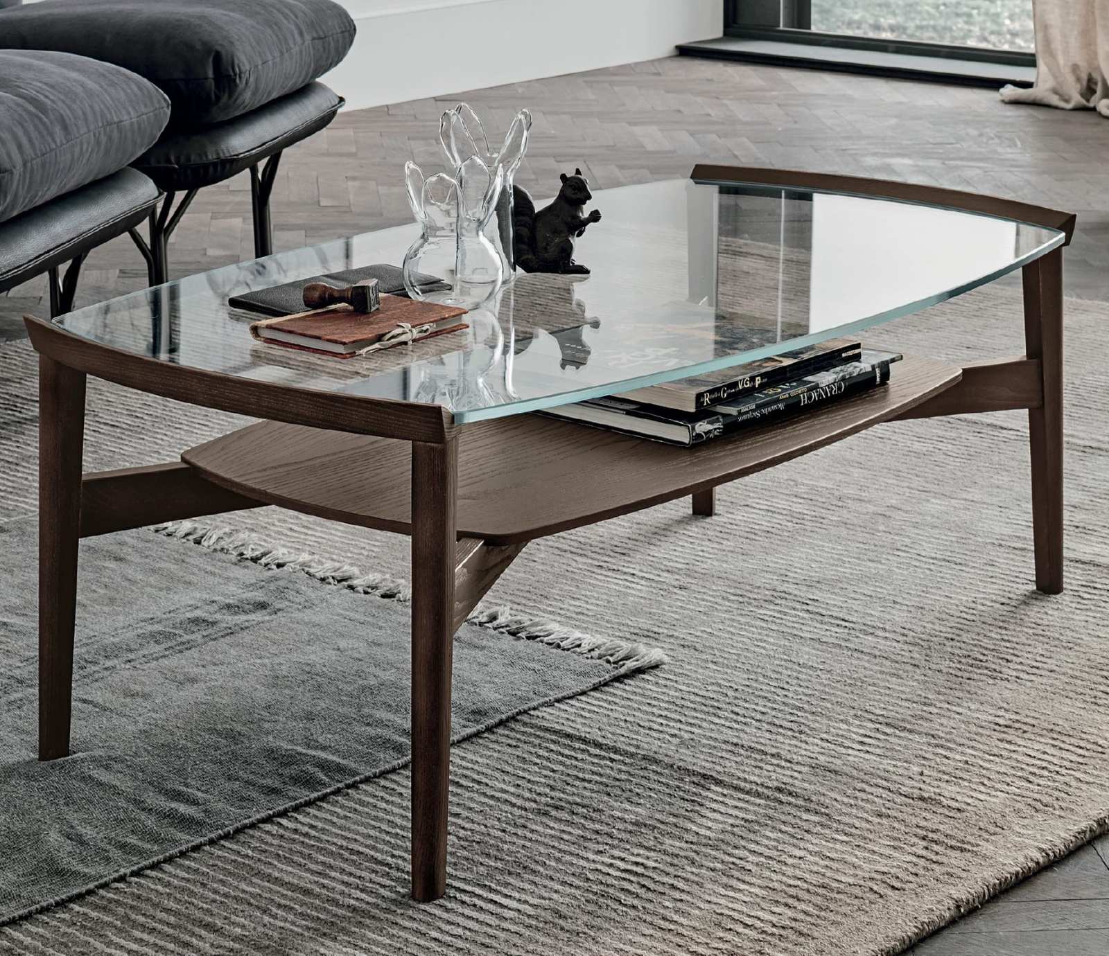 Konferenční stolek Bloom je vyrobený z masivního lakovaného dřeva s deskou z čirého skla o tloušťce 8 mm.