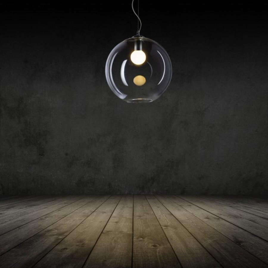 Závěsné svítidlo se stínidlem z ručně foukaného čirého skla a chromovými doplňky. Pro úsporné světelné zdroje s paticí E27. Drobné bublinky ve skle jsou způsobeny výrobním procesem, nejedná se o vadu stínidla.